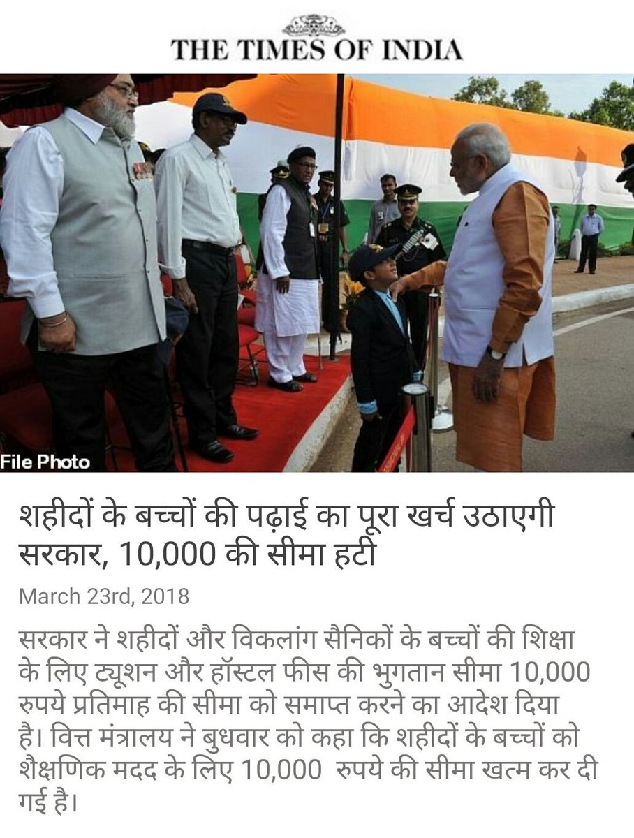शहीदों के बच्चों की पढ़ाई का पूरा खर्च उठाएगी सरकार, 10,000 की सीमा हटी https://timesofindia.indiatimes.com/india/govt-removes-education-fee-cap-of-rs-10000-per-month-for-martyrs-children/articleshow/63418808.cms … via NMApppic.twitter.com/yMkIoxCK3I