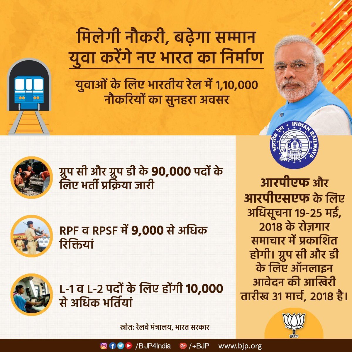 मिलेगी नौकरी, बढ़ेगा सम्मान युवा, करेंगें नए भारत का निर्माण : युवाओं के लिए भारतीय रेल में 1,10,000 नौकरियों का सुनहरा अवसर। http://www.indianrailways.gov.in pic.twitter.com/E24w0SfUfE