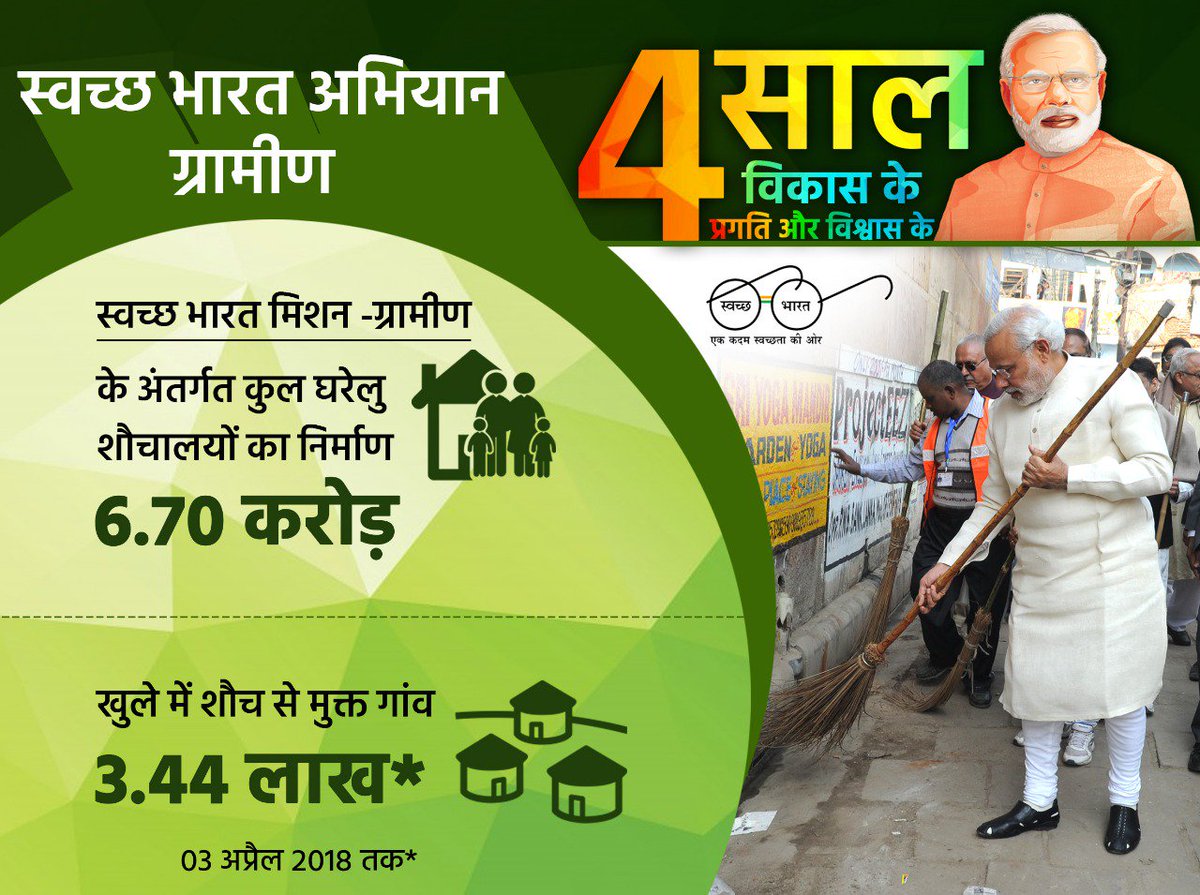 4 साल विकास के, प्रगति और विश्वास के : स्वच्छ भारत मिशन ग्रामीण के अंतर्गत 6.70 करोड़ शौचालयों का निर्माण कर 3.44 लाख गावों को खुले में शौच से मुक्त किया गया।pic.twitter.com/aAP6rLZMsQ