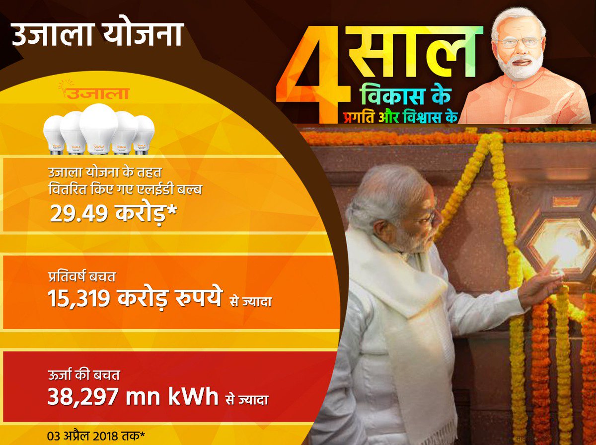 4 साल विकास के, प्रगति और विश्वास के : उजाला योजना के तहत 29.49 करोड़ एलईडी बल्ब वितरित किए गए।pic.twitter.com/F7wsyIbu1v