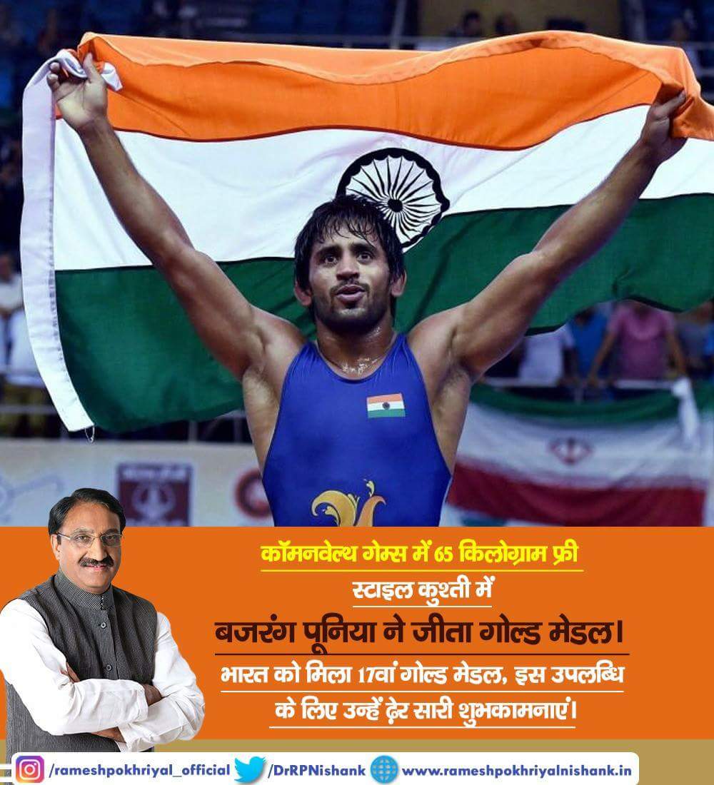 कॉमनवेल्थ गेम्स में 65 किलोग्राम फ्री स्टाइल कुश्ती में बजरंग पूनिया ने जीता गोल्ड मेडल। भारत को मिला 17वां गोल्ड मेडल, इस उपलब्धि के लिए उन्हें ढ़ेर सारी शुभकामनाएं।pic.twitter.com/hntOMVUECR