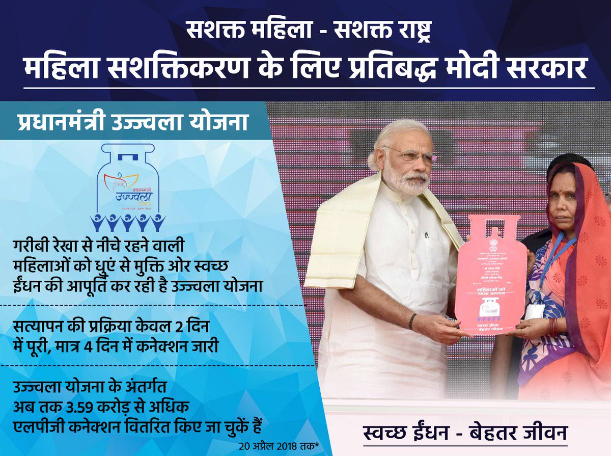 महिला सशक्तिकरण के लिए प्रतिबद्ध मोदी सरकार - उज्ज्वला योजना के अंतर्गत अब तक 3.59 करोड़ से अधिक मुफ्त एलपीजी कनेक्शन वितरित किए गए।pic.twitter.com/WJo1zfCz3F
