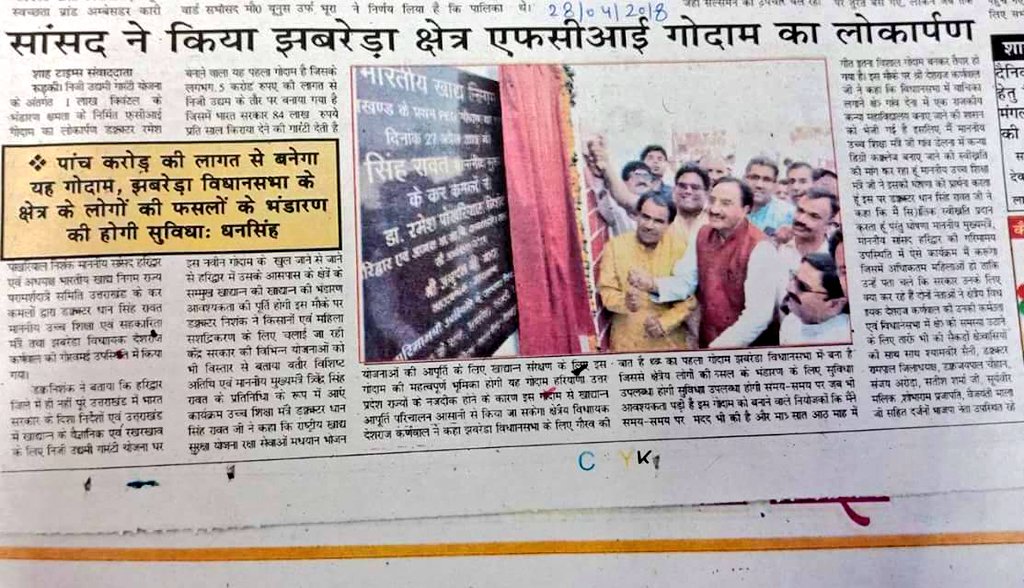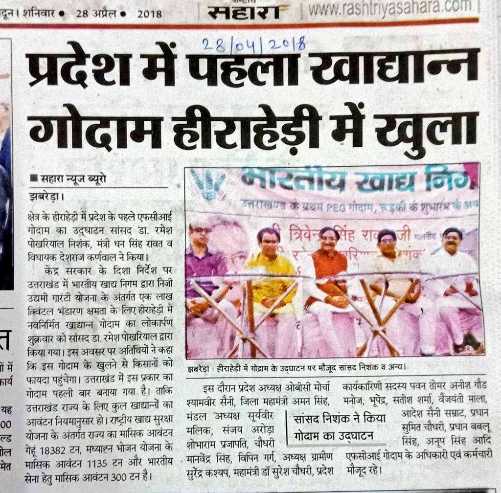 भारतीय खाद्य निगम के द्वारा रुड़की में एक लाख क्विंटल भंडारण क्षमता के निर्मित गोदाम के खुल जाने से राज्य में किसी आपदा एवं विषम परिस्थितियों में खाद्यान्न की आपूर्ति दुर्गम स्थानों को भी सुचारु रुप से की जा सकेगी।pic.twitter.com/KAgoJKykk7