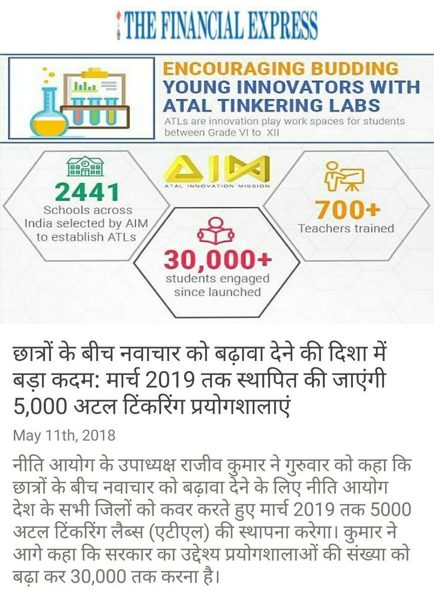छात्रों के बीच नवाचार को बढ़ावा देने की दिशा में बड़ा कदम: मार्च 2019 तक स्थापित की जाएंगी 5,000 अटल टिंकरिंग प्रयोगशालाएं https://www.financialexpress.com/lifestyle/science/big-move-to-promote-innovation-among-students-5000-atal-tinkering-labs-to-be-set-up-by-march-2019/1162934/ … via NMApppic.twitter.com/VzNoVa9C5A