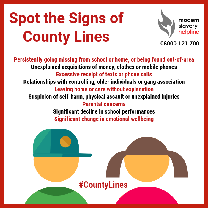 #CountyLines drugs gangs often exploit children and the vulnerable to make big profits. Ensure you can spot the signs of county lines exploitation and call the@MSHelpline for support and guidance.pic.twitter.com/M9RJDH5646