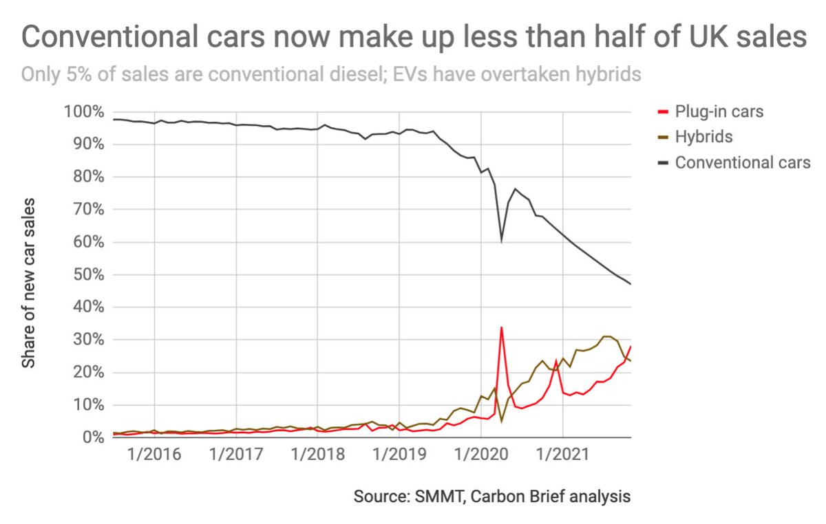 In 5yrs, conventional cars have gone from 96% of all new sales down to 48%. Wow. Oct 2021 was only their 2nd ever month below 50%. (Also interesting to see plug-in cars outselling hybrids).pic.twitter.com/nvdVq2ldTQ