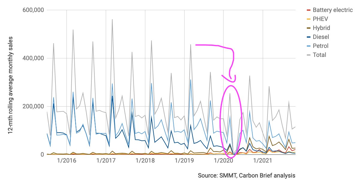 The chart shows share of sales and there was a massive dip overall that month due to Covid, whereas I suspect a lot of EV sales were on pre-order waiting for delivery (It was actually less a dip than a smaller April bump than usual, but hopefully you get the point)pic.twitter.com/JfRkXSuTbB