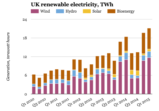 UK renewables generate record output in Q1 '15 & supply record 22% of power supplies. Huge growth for solar, biomass.pic.twitter.com/yZ8OtoKeXQ