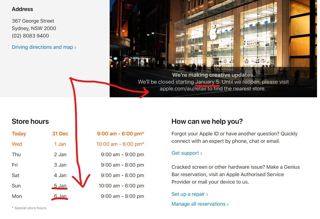The George St Apple Store in Sydney will be both open and closed on the 5th and 6th of January. https://www.apple.com/au/retail/sydney/ …