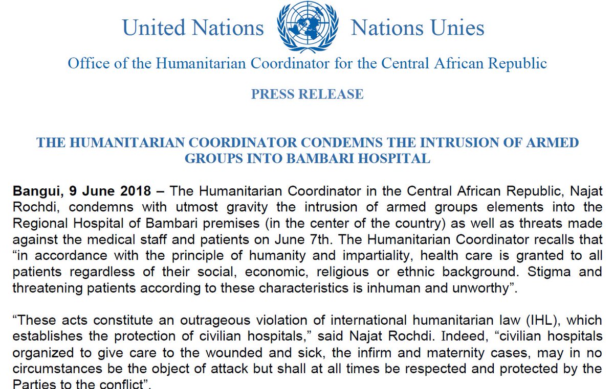 The #Humanitarian Coordinator @rochdi_najat condemns with utmost gravity the intrusion of armed groups into the Regional Hospital of #Bambari premises as well as threats made against the medical staff and patients #CARcrisis #Protractedcrisis ➨http://bit.ly/2JtGEPf  pic.twitter.com/NUjPy3Warf