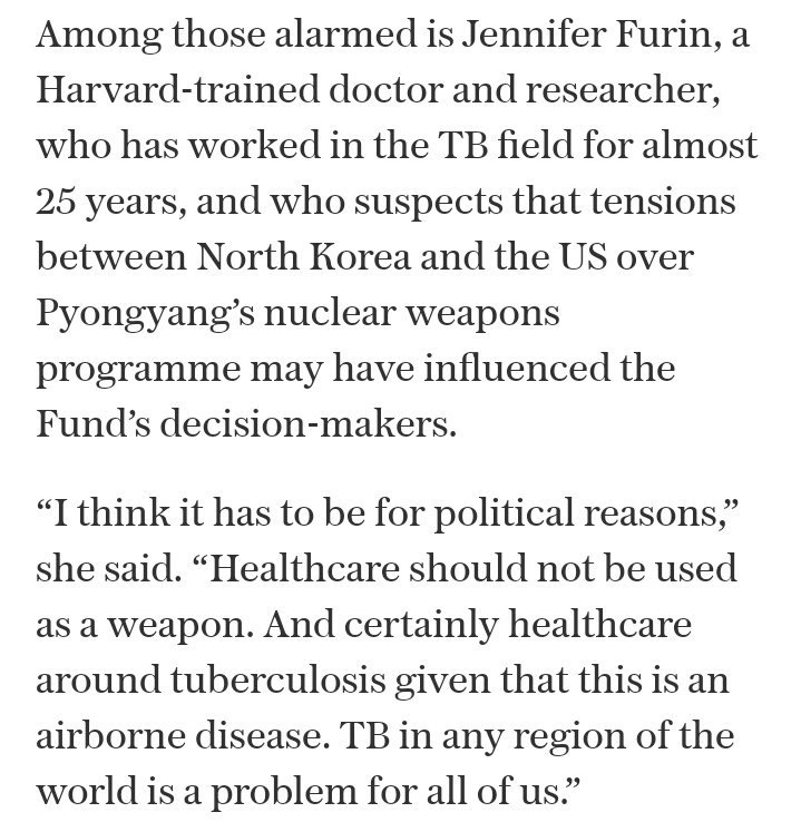 Indeed! @GlobalFund sacrificed the TB & malaria grant for #NorthKorea to protect 💰 from donor 🇺🇸 "explosion of MDR-TB.. decades to clean up.. detrimentally affect China and South Korea" #AMR #globalhealth https://www.telegraph.co.uk/news/2018/06/27/north-korea-braced-tb-superbug-explosion-medics-warn-funding/ …pic.twitter.com/2sIsyaGvb7