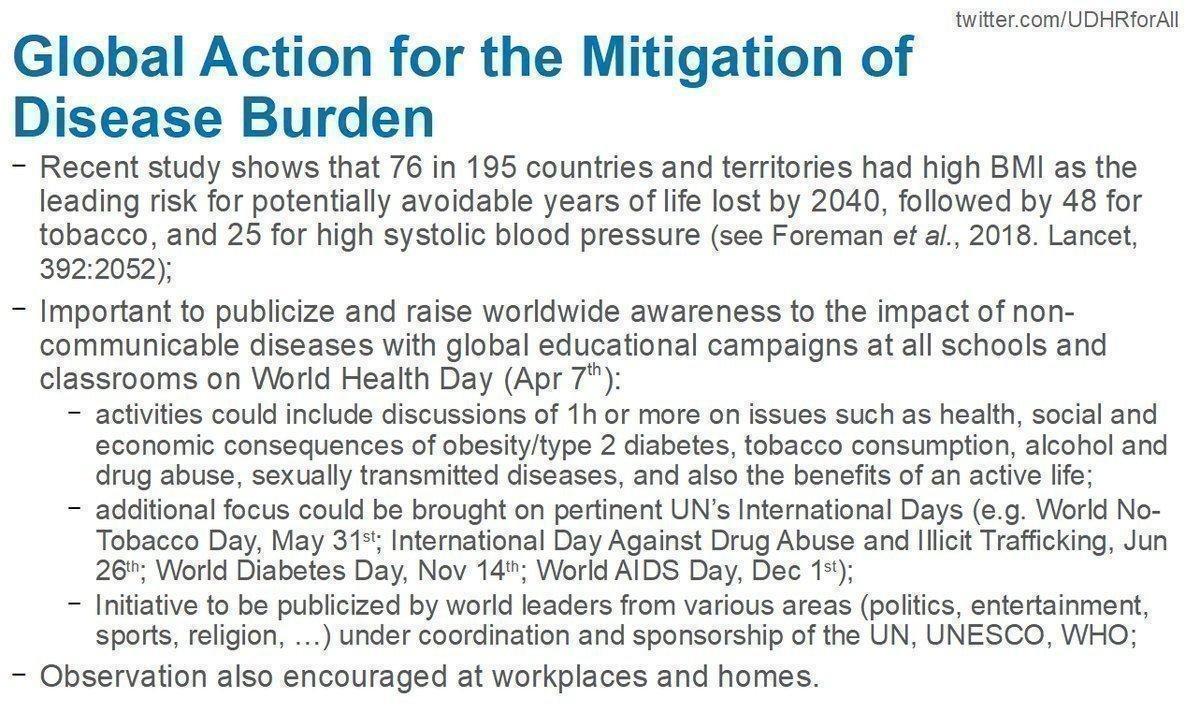 @antonioguterres @AAzoulay Low cost, preemptive, high, long term impact: To promote, sustain #HealthForAll, beat #NCDs, please start global yearly educational campaign to reduce disease burden at all classrooms in the world on @UN #WorldHealthDay, other UN Int Days. Thank you.pic.twitter.com/tlwTLHRZcM