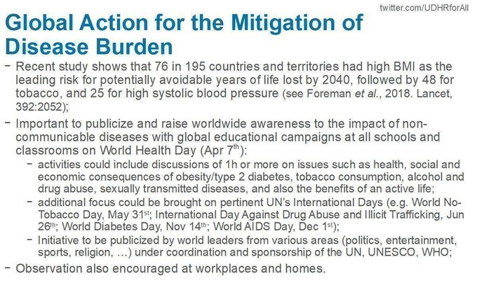 @antonioguterres @AAzoulay Low cost, preemptive, high, long term impact: To promote, sustain #HealthForAll, beat #NCDs, reduce needs, start global yearly educational campaign to reduce disease burden at all classrooms in the world on @UN #WorldHealthDay, other UN Int Days. Thankspic.twitter.com/dz3DUzrL21