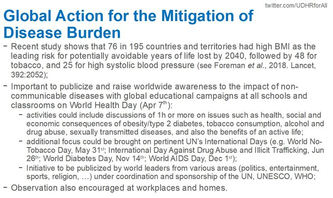 @antonioguterres@AAzoulay Low cost, preemptive, high, long term impact: To promote, sustain#HealthForAll, lower needs, beat#NCDs, start global yearly educational campaign to reduce disease burden at all classrooms in the world on@UN#WorldHealthDay, other UN Int Days. Thanks.pic.twitter.com/i1vTWaamAD