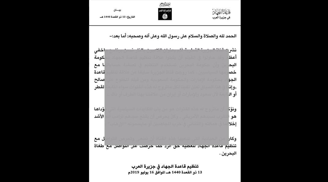 #AlQaeda is fed up of being a pawn in Gulf politics: Rare new#AQAP statement denies claims by#Qatar's@AJArabic that#Bahrain is using AQ to kill opponents. Also denies colluding with#UAE,#Saudi or#Iran. Says rival Gulf regimes are competing to impress "their master Trump"pic.twitter.com/czARU218QR