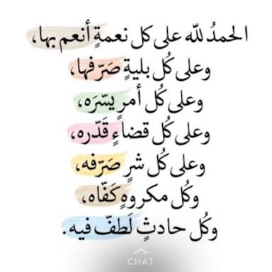 الحمدلله على كل نعمة أنعم بها، وعلى كل بلية صرفها، وعلى كل أمر يسّره، وعلى كل قضاء قدره، وعلى كل شر صرفه، وكل حادث لطف فيه.
