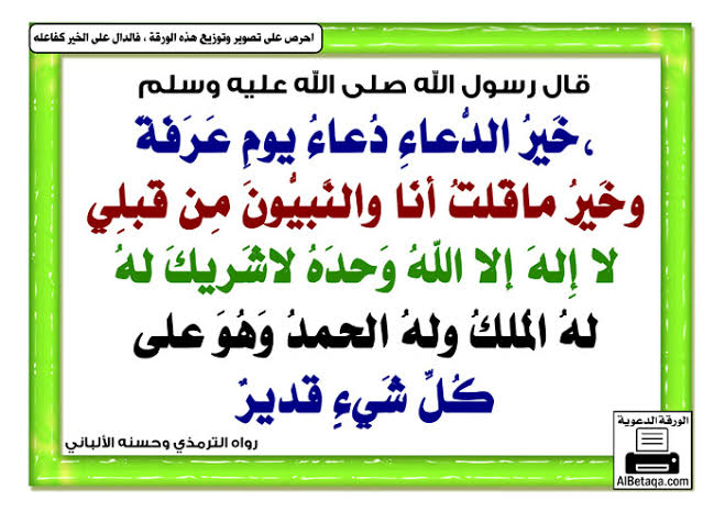 لا إله إلا الله، وحده لا شريك له، له الملك وله الحمد، وهو على كل شيء قدير قال النبي ﷺ : خير الدعاء دعاء يوم عرفة، وخير ما قلت أنا والنبيون من قبلي "لا إله إلا الله وحده لا شريك له له الملك وله الحمد وهو على كل شيء قدير"