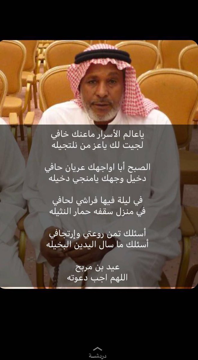 #عيد_بن_مربح قال يوماً : أول الدنيا طرب ، وأوسط الدنيا عذاب وأخرتها : الموت ، والقبر ، وحسابٍ عسير ياجـزيل الملك يا كـافـلٍ رزق الذياب يـاإلهي من عذابك برحمتك أستجير اللهم أجره من عذاب القبر ، وارحمه برحمته ياودود - 1 more reply