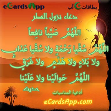 "اللَّهُمَّ سُقْيَا رَحْمَةٍ ، لَا سُقْيَا عَذَابٍ ، وَلَا هَدْمٍ ، وَلَا غَرَقٍ، اللهم اجعله صيّباً نافعاً"