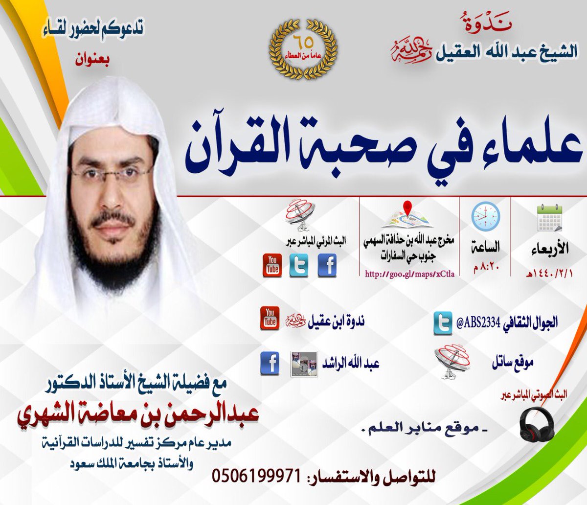 #القرآن_العظيم وأهله وخاصته.. تدعوكم ندوة والدي#ندوة_الشيخ_عبدالله_العقيل_رحمه_الله لحضورها يوم الأربعاء القادم مع الضيف الشيخ د.عبدالرحمن بن معاضة الشهري@abs2334@amshehri@NoohAlshehri@ALSHEHRI89 حياكم الله جميعاً الموقع: http://goo.gl/maps/xCtla pic.twitter.com/J7krAwNzDDThis media may contain sensitive material. Learn more