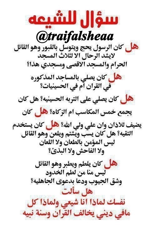 أسئلة للشيعة عن عقيدتهم الباطلة انشرها قد تكون سبب في تسنن الكثير من الشيعة ولاتوقف عندك #ريتويتpic.twitter.com/IRgkZ3BU