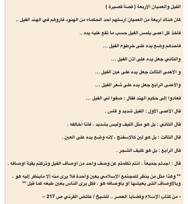 @Dr_alqarnee الفيل والعميان الأربعة ( قصة قصيرة ).pic.twitter.com/50rE1Jfe