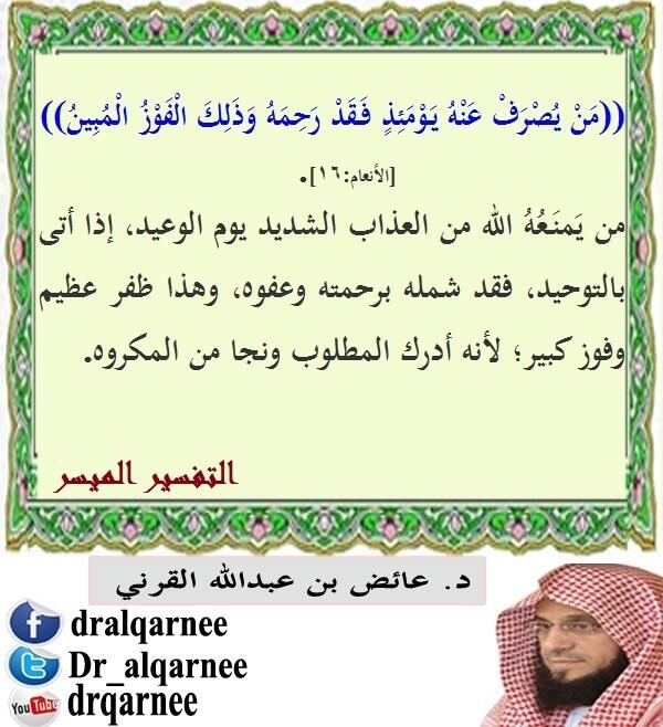 @Dr_alqarnee: ((مَنْ يُصْرَفْ عَنْهُ يَوْمَئِذٍ فَقَدْ رَحِمَهُ وَذَلِكَ الْفَوْزُ الْمُبِينُ)) [الأنعام:16]. pic.twitter.com/VIQ3rlTS8S”