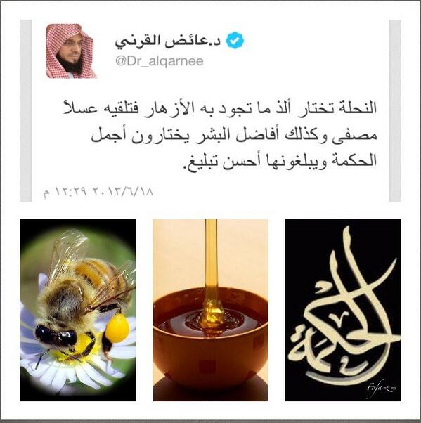 “@Dr_alqarnee: النحلة تختار ألذ ما تجود به الأزهار فتلقيه عسلاً مصفى وكذلك أفاضل البشر يختارون أجمل الحكمة ويبلغونها أحسن تبhليغ.”