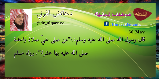 @Dr_alqarnee: قال رسول الله صلى الله عليه وسلم: "من صلى عليّ صلاة واحدة صلى الله عليه بها عشرا". رواه مسلمpic.twitter.com/KlOCFdAgpi