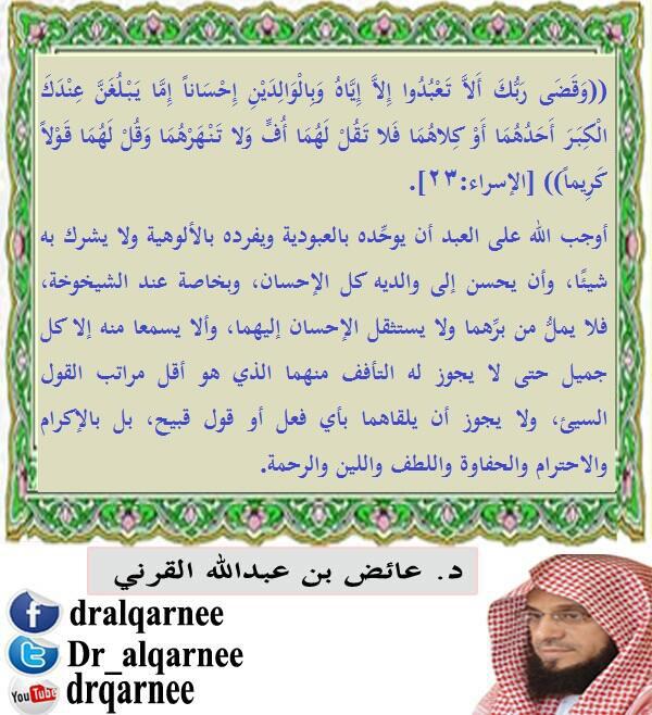 “@Dr_alqarnee: (وَقَضَى رَبُّكَ أَلاَّ تَعْبُدُوا إِلاَّ إِيَّاهُ وَبِالْوَالِدَيْنِ إِحْسَاناً...) pic.twitter.com/EpyG9KuDz9”