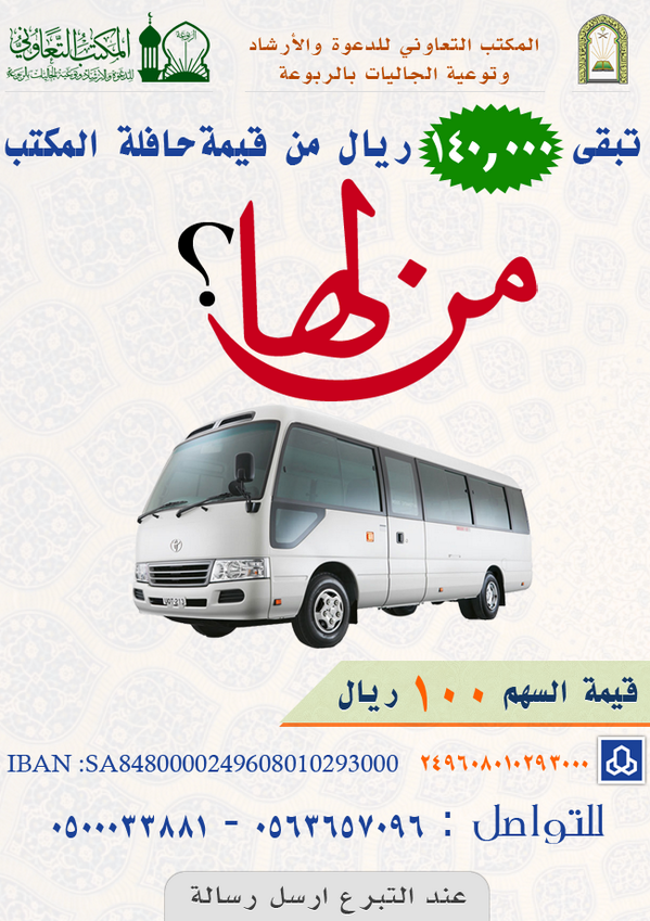 @Dr_alqarnee تبقى 140.000 ريال من قيمة حافلة المكتب التي تخدم برامج الدعوة في مركز الربوعة . من لها ؟ pic.twitter.com/JgPCTOXWuB#غرد_بصورة