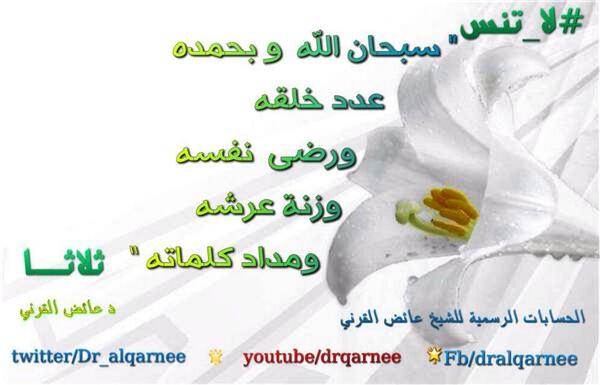 “@Dr_alqarnee: لا تنس {سبحان الله وبحمده، عدد خلقه، ورضى نفسه، وزنة عرشه، ومداد كلماته} (ثلاثاً). pic.twitter.com/S6bRxMVBPr”