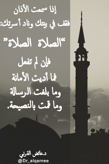 @Dr_alqarnee: إذاسمعت الأذان فقف في بيتك وناد أسرتك: "الصلاة الصلاة" فإن لم تفعل فما أديت الأمانة وما بلغت الرسالة وما قمت بالنصيحة.”Thanks. Twitter will use this to make your timeline better. UndoUndo