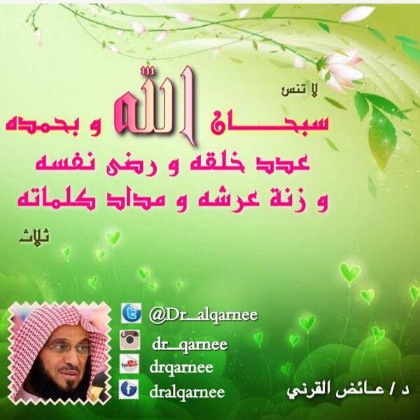 @Dr_alqarnee: لا تنس {سبحان الله وبحمده، عدد خلقه، ورضى نفسه، وزنة عرشه، ومداد كلماته } (ثلاث). pic.twitter.com/oPHHJ2Kc9g”