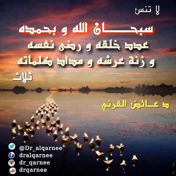 @Dr_alqarnee: لا تنس {سبحان الله وبحمده، عدد خلقه، ورضى نفسه، وزنة عرشه، ومداد كلماته } (ثلاث). pic.twitter.com/vALxWbsleZ”