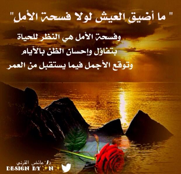 @Dr_alqarnee: "ما أضيق العيش لولا فسحة الأملِ"، وفسحة الأمل هي النظر للحياة بتفاؤل وإحسان الظن بالأيام وتوقع الأجمل فيما يستقبل من العمر.”Thanks. Twitter will use this to make your timeline better. UndoUndo