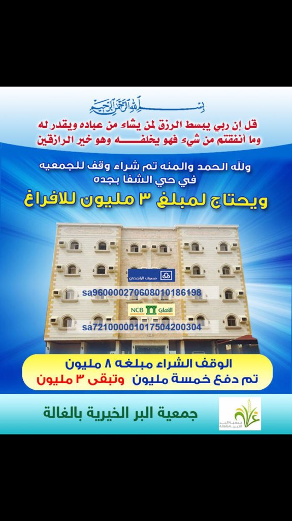 @Dr_alqarnee@ksa_100_100 وقف جمعيه البر الخيريه بالغاله في حي الشفا بجده ساهموا معنا بدعمه ونشره جزاكم الله خيرpic.twitter.com/RdRAi20BAR