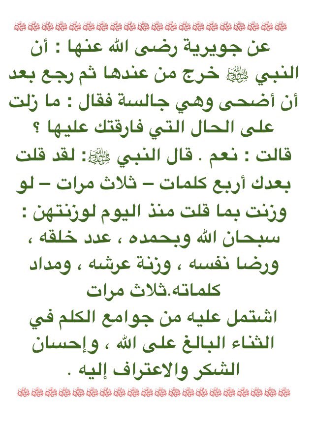 سبحان الله وبحمده عدد خلقه ورضا نفسه وزنة عرشه ومداد كلماته ...