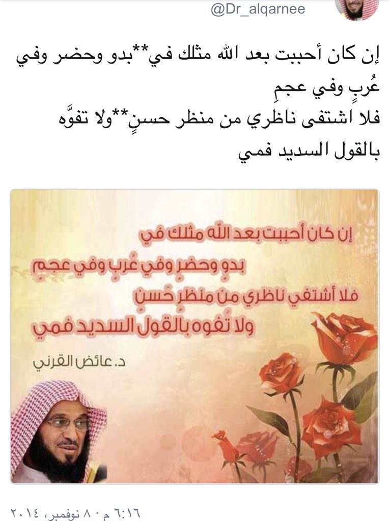 ٨ نوفمبر ٢٠١٤ .الشيخ عائض القرني إن كان أحببت بعد الله مثلك في **** بدو وحضر وفي عرب وفي عجم فلا اشتفى ناظري من منظر حسن *****ولا تفوه بالقول السديد فمي...pic.twitter.com/qtUn9jC8vm