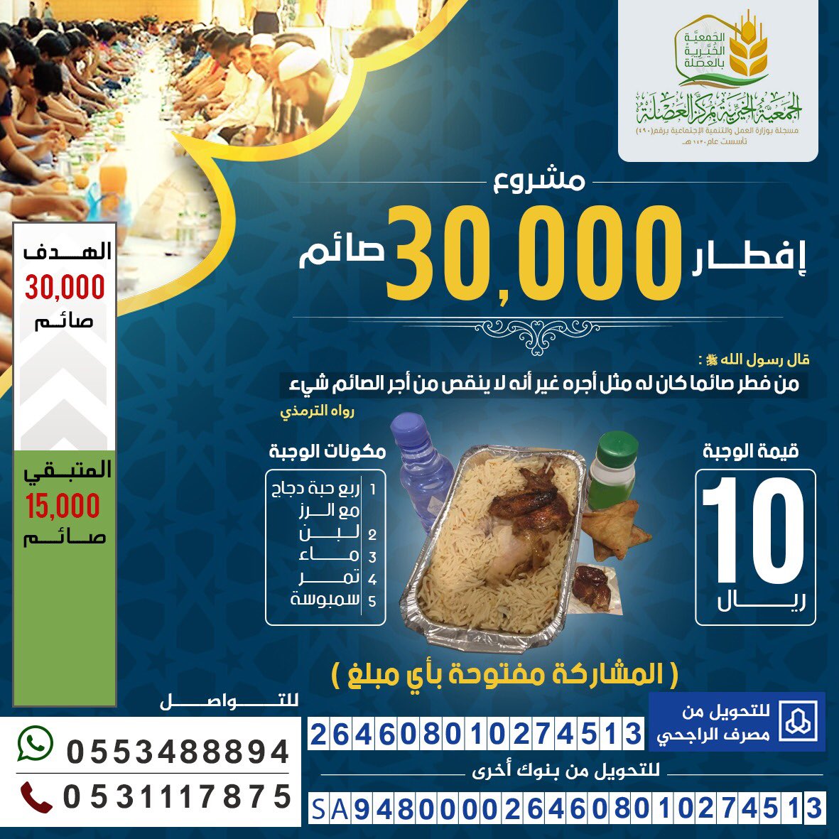 نبشركم بأنه بقي النصف من مشروع #افطار_30_الف_صائم ، والصائم بـ ( 10 ريالات ) ونبشركم بالبشارة النبوية بأنه من فطّر صائما كان له مثل أجره، فساهموا رعاكم الله فالعمل يسير والأجر كبير إن شاء الله .. " تقبل الله منا ومنكم "pic.twitter.com/dCQp1XnNxK