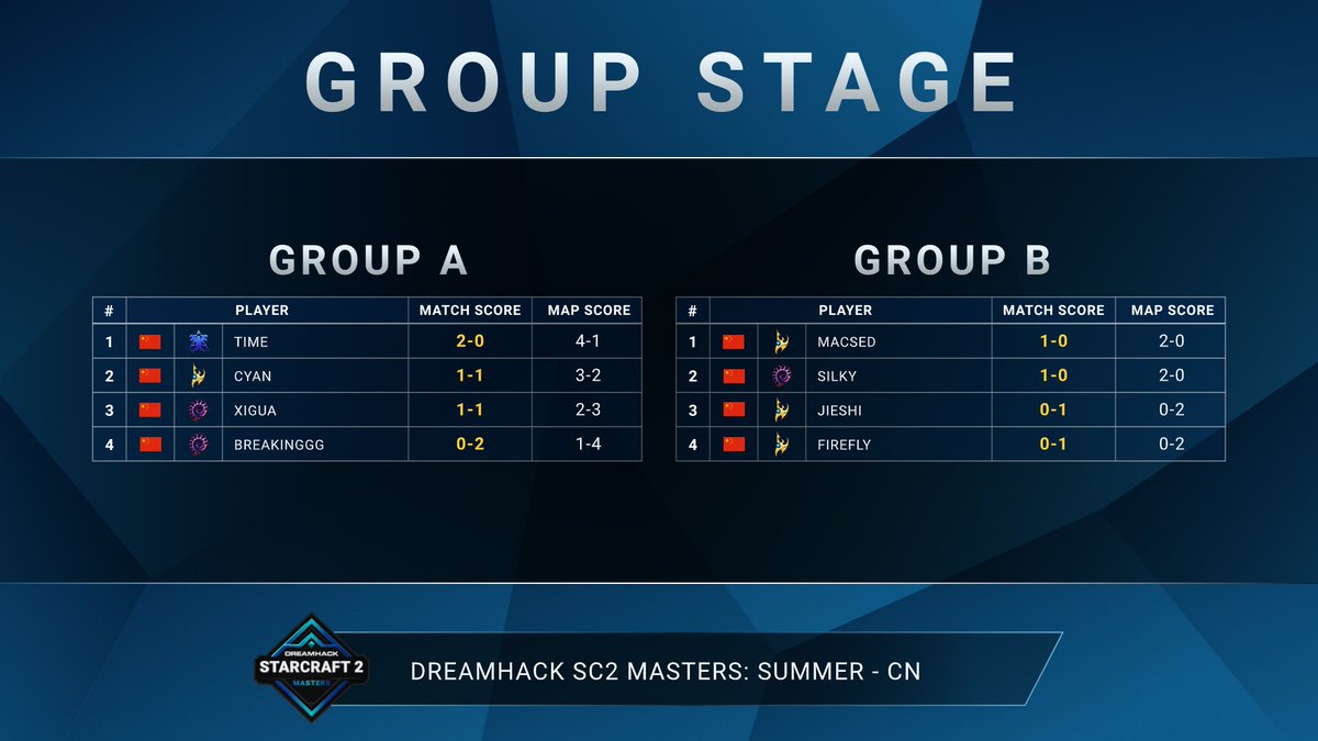 Here's the current standings for DreamHack SC2 Masters Summer: CN Group Stage!