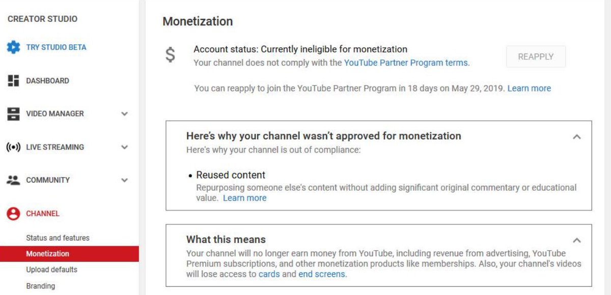 @TeamYouTube My channel got demonatized for "reused content" on my 29, 2019, I contacted the support, didn't get any clear answers regarding which of my content is considered reused. I don't think my channel should fall under "reused content". I am Gamer.pic.twitter.com/3jSWaCz6QT