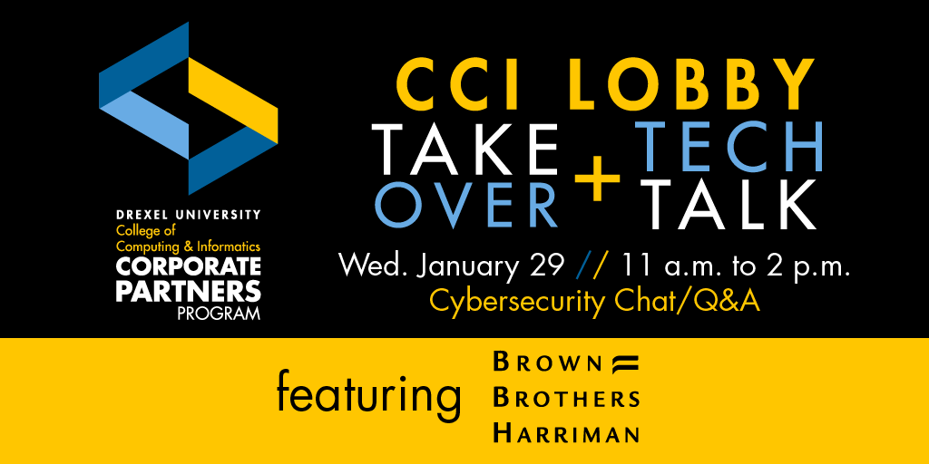 #BrownBrothersHarriman will be on the 10th floor from 11a-2p with a Q&A on#Cybersecurity at noon. All CCI students are welcome - RSVP at http://drexelcci.info/bbhlobby#FinTech#DrexelCCI#AmbitionCantWaitpic.twitter.com/vXYh6r4XGw