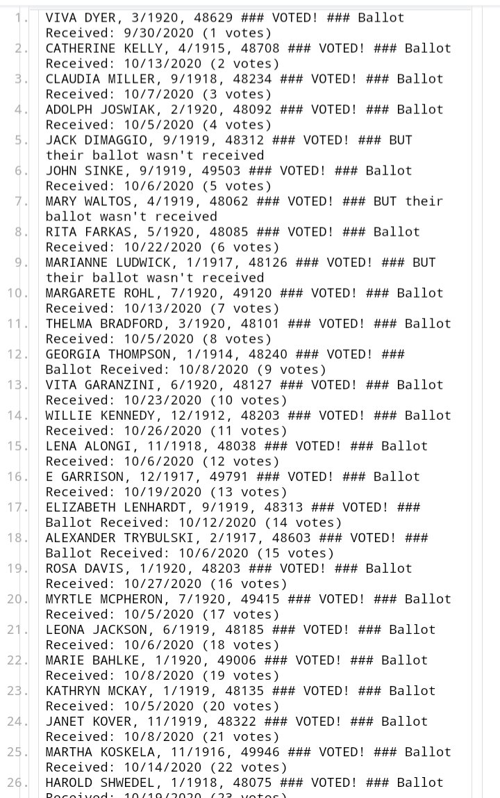 @realDonaldTrump I forwarded this to your team. I now have in my possession the full list of almost 10K dead voters who voted for Biden here in Michigan. The Trump team now has the full list! This is just a sample for all of you. pic.twitter.com/MPMSPIIiL6