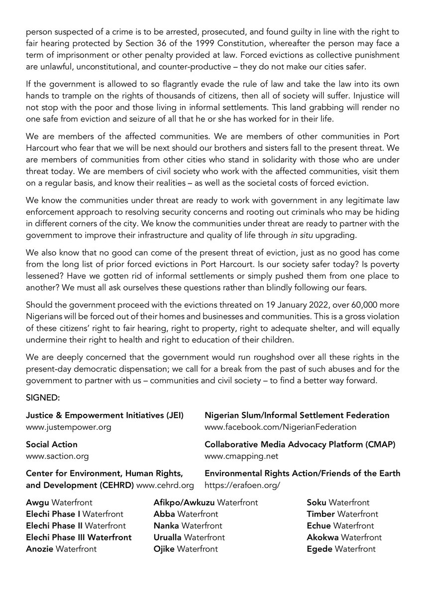 JOINT PRESS STATEMENT: JEI and our civil society partners condemn the ongoing forced eviction of waterfront communities in the Diobu axis of Port Harcourt, Rivers Statepic.twitter.com/w5shpWFNIB