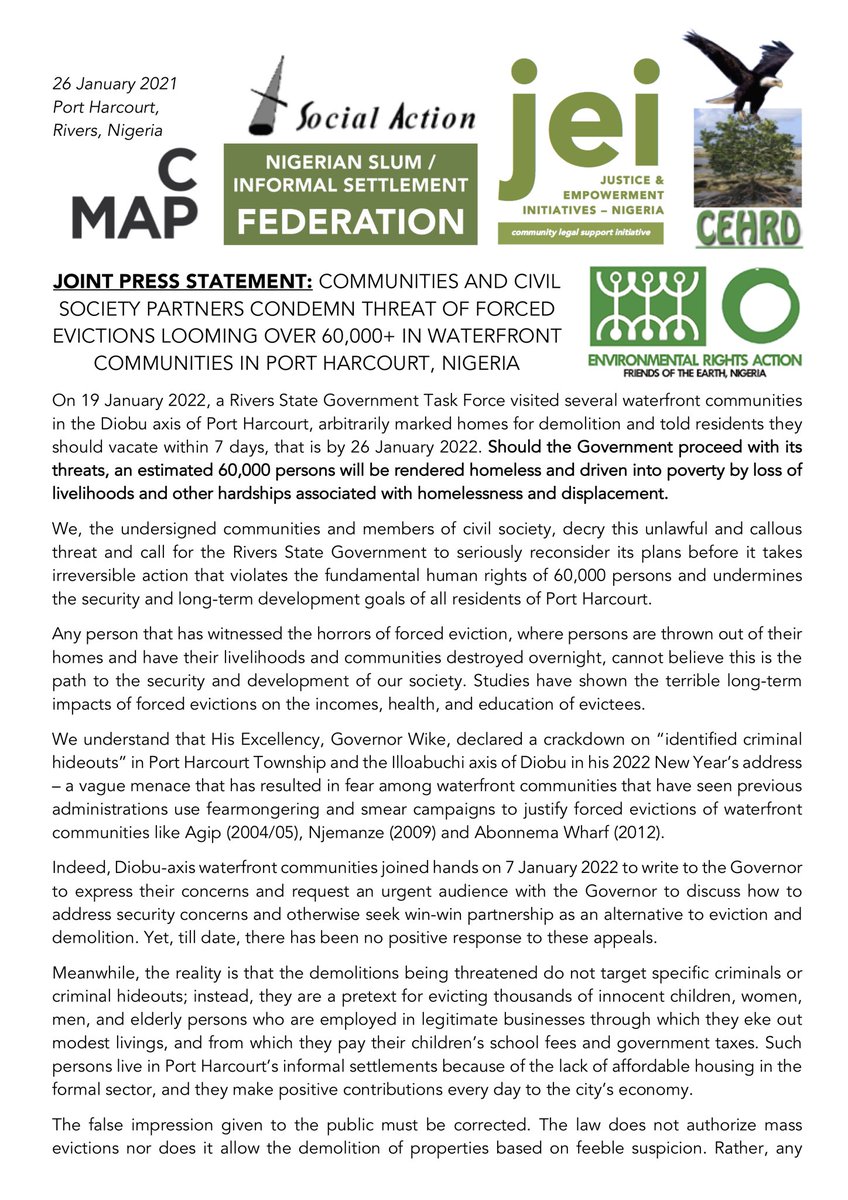 #Diobu Communities and CSO Partners Condemn Threat of Forced Evictions Looming over 60,000+ Waterfront Communities in Port Harcourt, Nigeriapic.twitter.com/OtBmYJpXqq