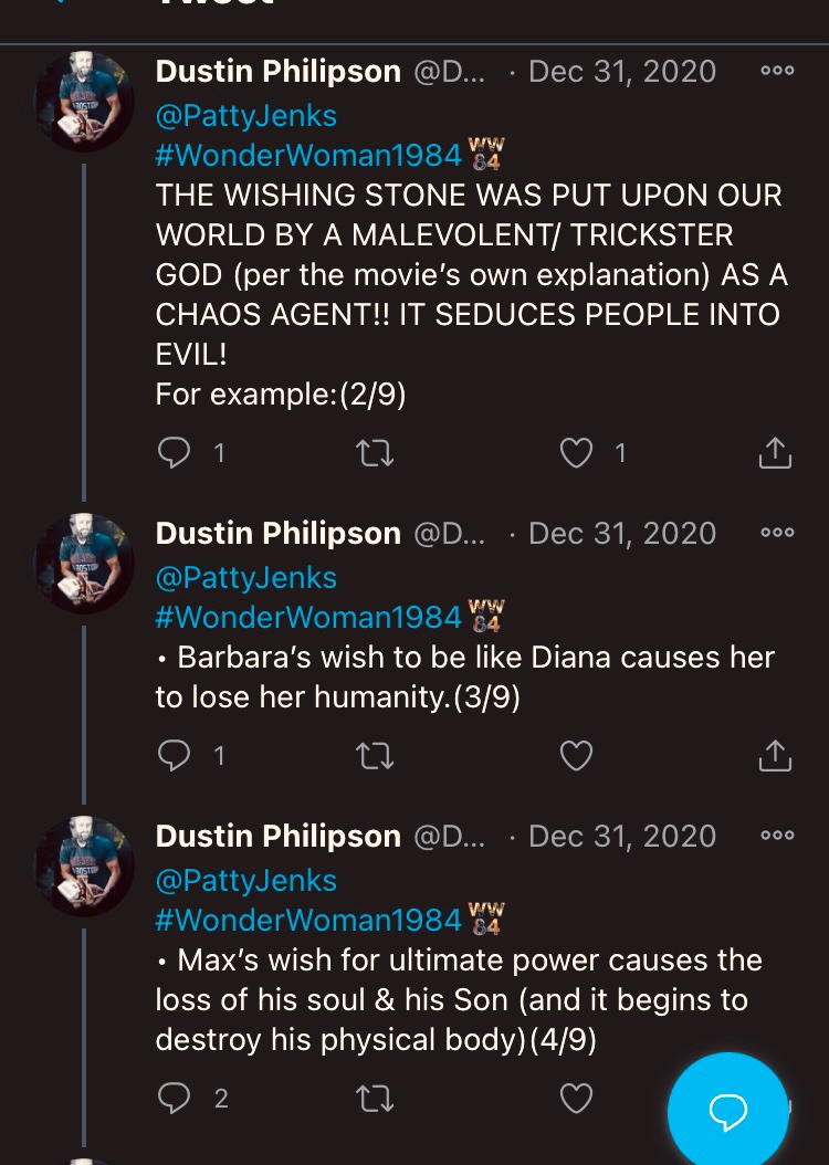 #WonderWoman1984@PattyJenks Like Diana, we’re distracted from the nefarious powers at play, unleashed by wishing upon the Stone. (8/9)Show this threadThanks. Twitter will use this info to make your timeline better. UndoUndo -