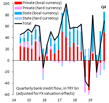 The intensity of credit expansion in Turkey is back to 2017 levels. Two things to note: (i) there is deleveraging in FX-denominated lending, which is good; (ii) private banks (red) have stepped up TRY-denominated lending sharply, the first time since the BoP "sudden stop" in 2018pic.twitter.com/h8q0pFfMaU