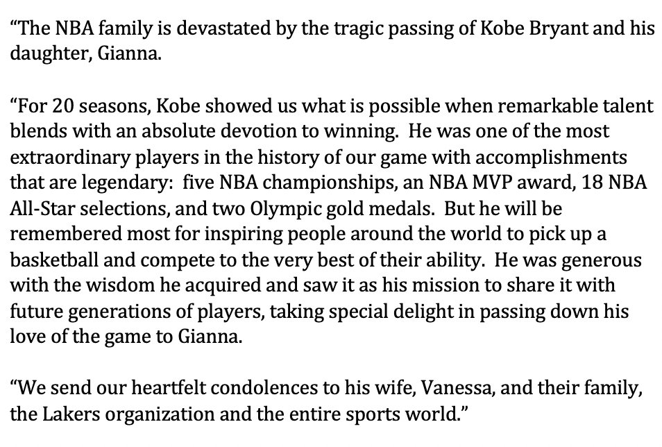 NBA Commissioner Adam Silver releases statement on passing of Kobe Bryant: ... "He was generous with the wisdom he acquired and saw it as his mission to share it with future generations of players, taking special delight in passing down his love of the game to Gianna." ...pic.twitter.com/XLRh7oKxsY