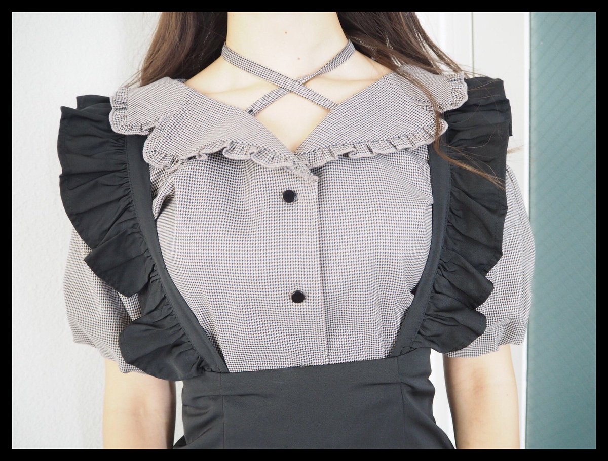 #ダブルクロスリブトップ#レースアップスカート#BIGリボンローファーパンプス ブラック×ブラウンチェックを合わせる事で大人なガーリーさを演出したコーデ